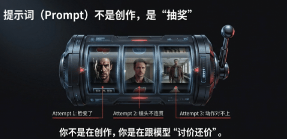 你开始继续改Prompt、加限制条件、调参数权重,像跟模型讨价还价,耗了几小时,还是交不出片。这时候你会发现,你根本不是在创作,而是在赌博,赌模型这次刚好符合预期,赌它不会崩任何细节。