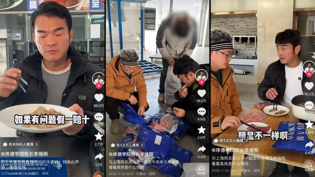 2025年1月6日-7日,抖音博主@体德学院校长李维刚 进行了首次原产地溯源直播,主推牛肉卷共卖出75万份。3天后, @奉贤周公子 发布视频,质疑其售卖的牛肉卷疑似为合成肉。涉事生产厂家亦澄清未与李维刚合作、未生产相关产品