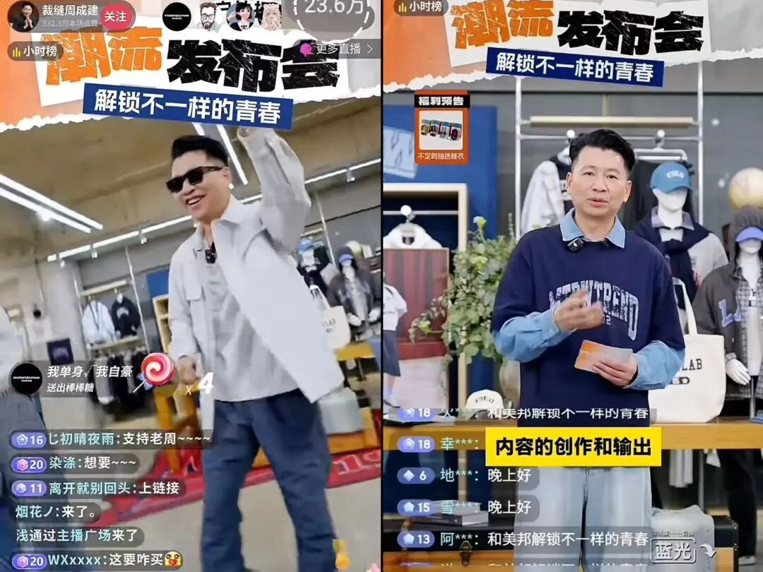 2025年8月,美特斯邦威创始人在自己的抖音直播间内,上演了一场特殊的新品发布会——60岁的周成建戴着墨镜、身穿白色夹克、藏蓝色运动裤,跟随着周杰伦演唱的《阳光宅男》,在镜头前卖力地跳起了团舞,为品牌的新品发布会助力。