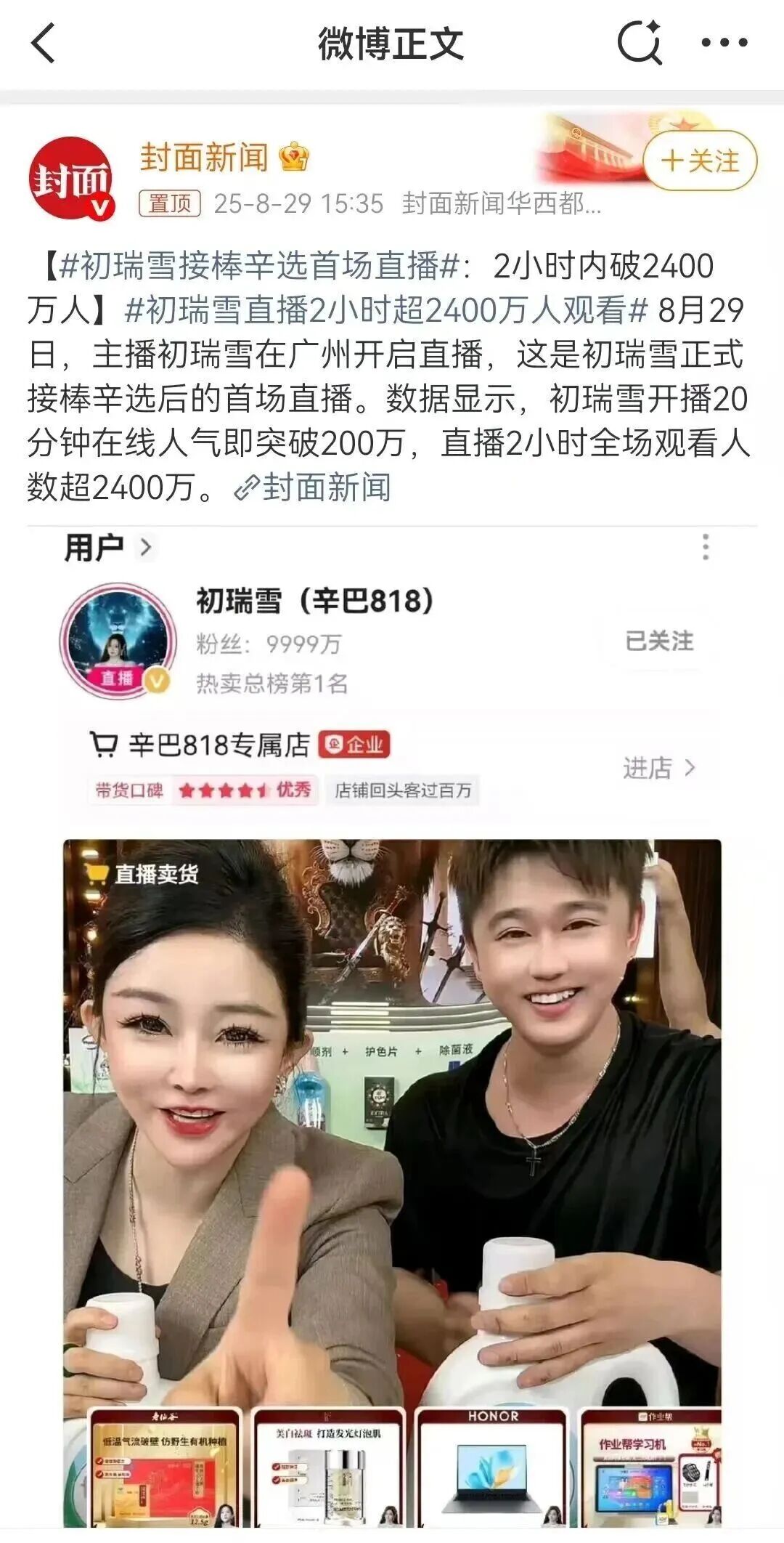 8月29日,接管了辛巴近亿粉丝账号的初瑞雪正式开启首场直播。期间,已宣布退网的辛巴多次连麦直播间,帮初瑞雪控场、互动,也间接安抚粉丝情绪。第三方数据显示:直播2小时内破2400万人,4小时销售额破10亿,天气丹套盒卖出60万单,联想平板8秒售罄20万台,累计销售额超过20亿。
