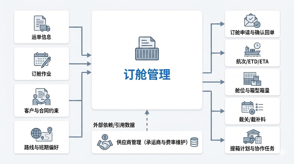 二、模块边界:订舱管理承接“运单/作业”,输出“订舱结果/计划”