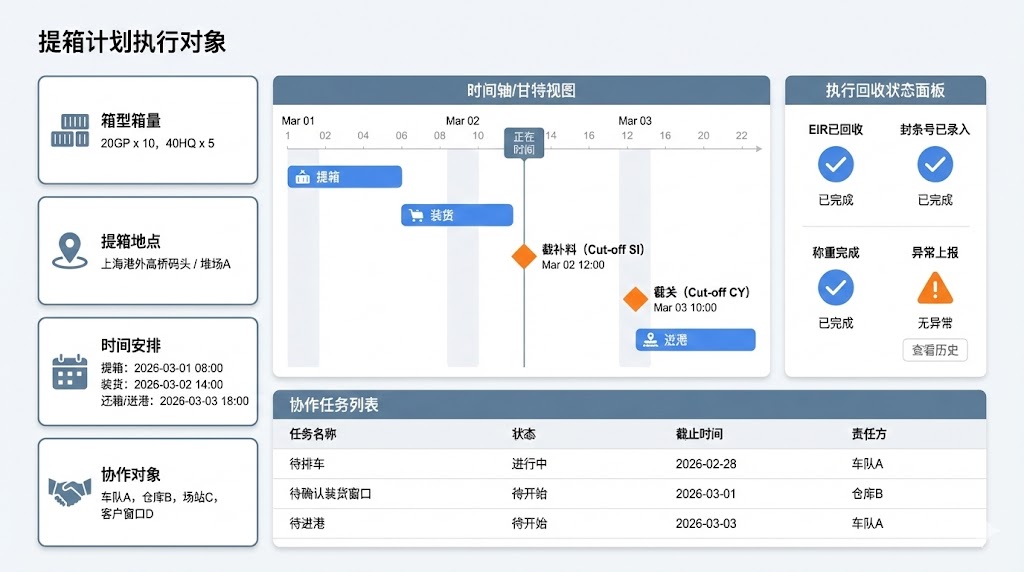 提箱计划不是一个表格,而是一个可跟踪的执行对象:可以推送到运输与仓储系统,回收执行状态(EIR、封条、称重等),形成端到端闭环。