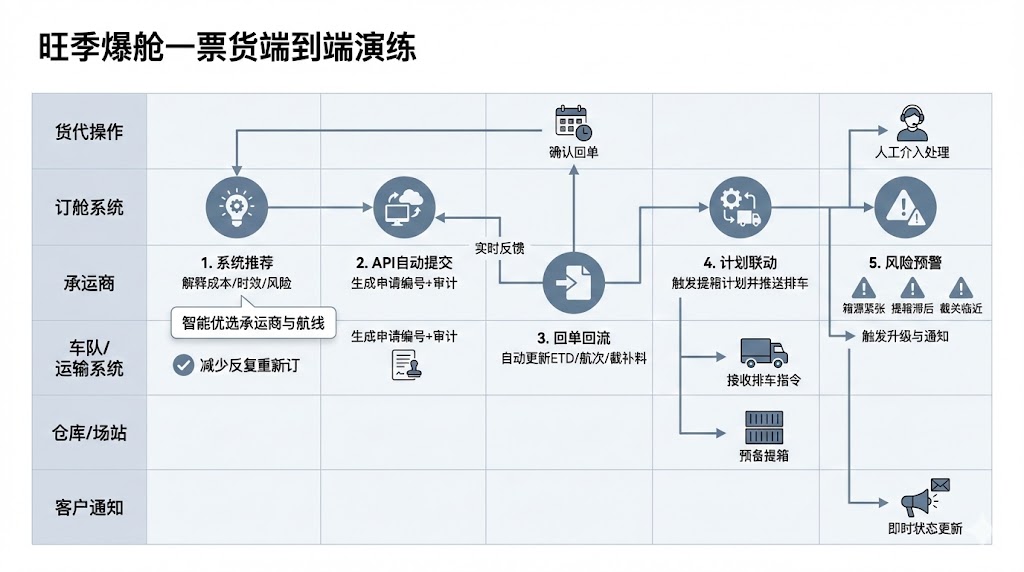 很多团队只管“订舱确认”,但旺季更常见的风险是: