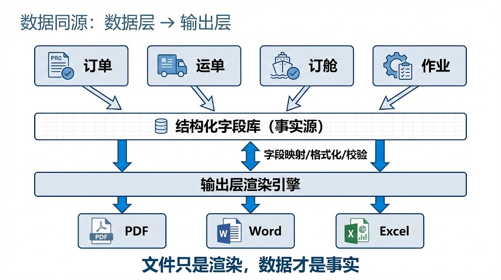 - 数据层:来自订单/运单/订舱/作业的结构化字段,以及单证特有字段(例如声明条款、签发信息)。