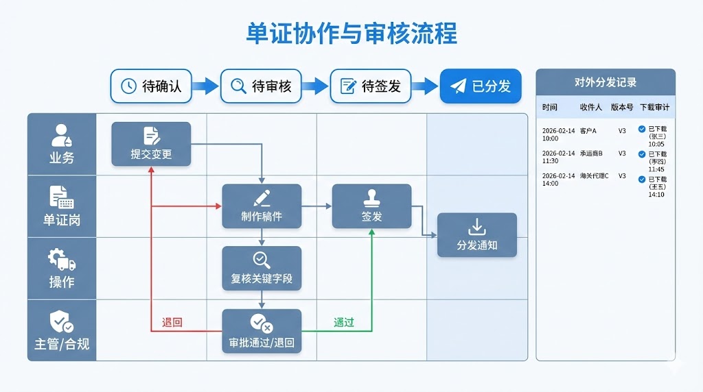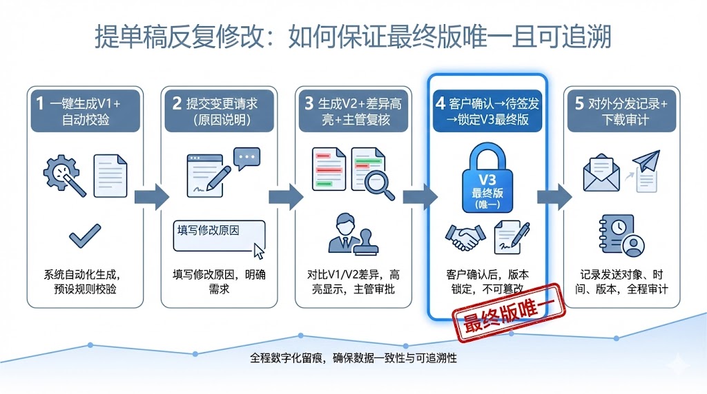 - 客户确认后,单证进入“待签发”,签发后版本锁定为V3(最终版)。