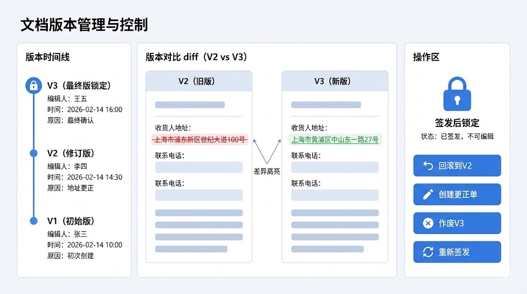 - 关键版本锁定:签发后不可随意修改,必须走“更正/作废/重签”流程