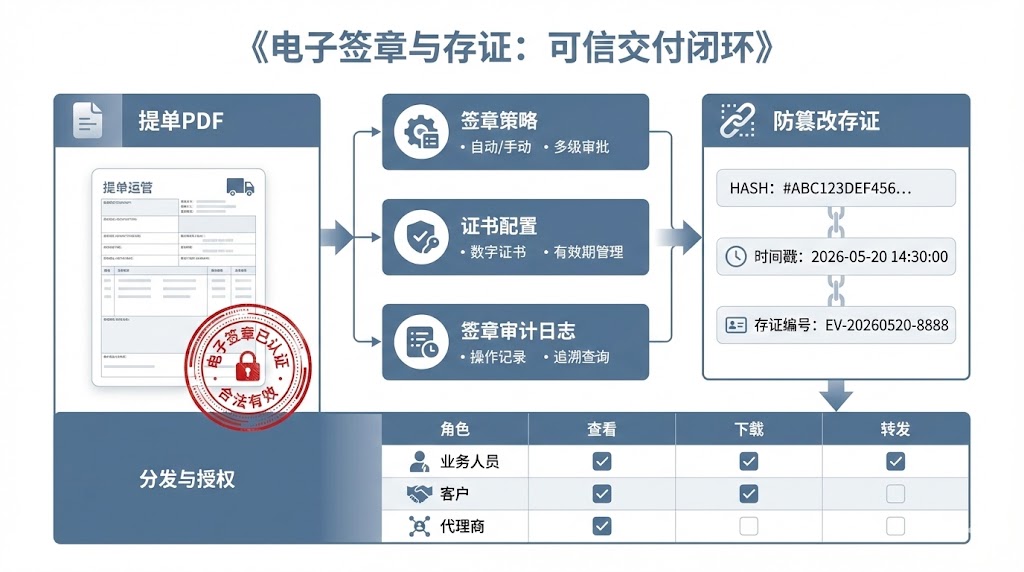随着电子化推进,单证交付逐步从“打印盖章快递”转向“在线签发与分发”。产品层面常见能力包括: