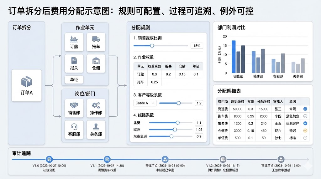 货代业务常见的现实是:一张订单拆成多个作业与多个岗位协作完成。费用如果只在“订单层”统计,会导致部门与个人贡献无法反映。