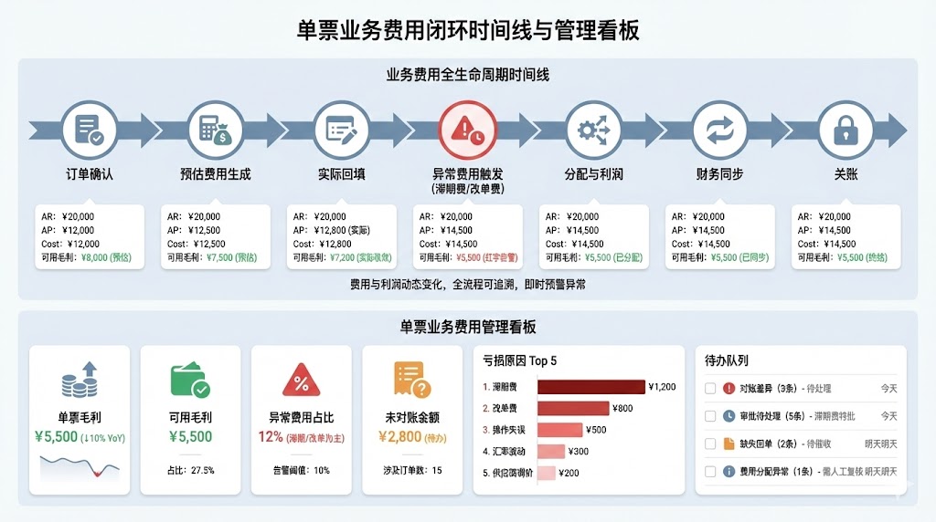 - 异常费用:若发生滞期费/改单费,异常模块触发费用新增并标记责任归属。