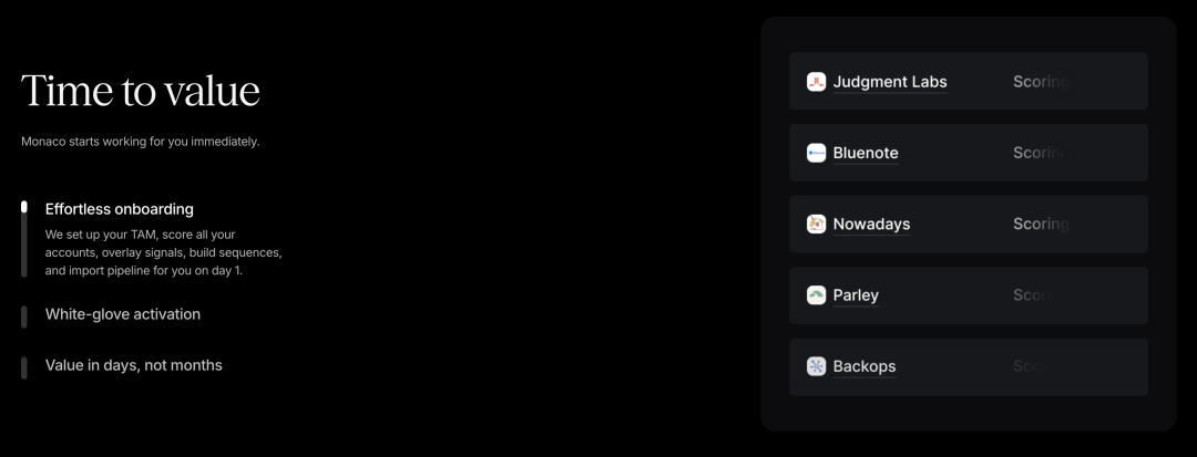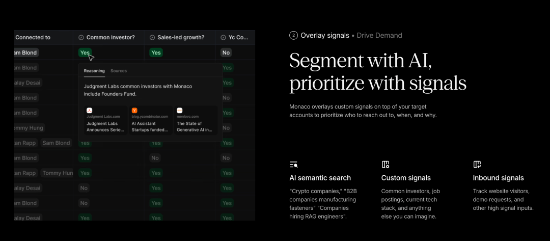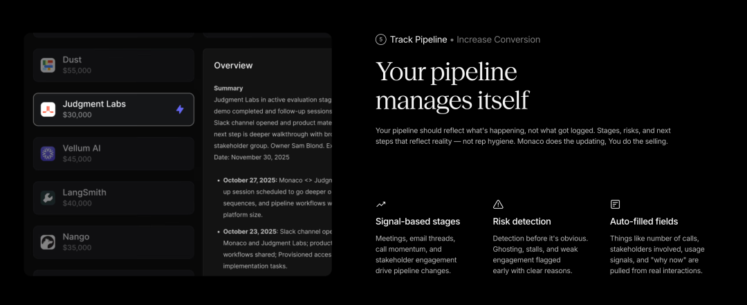让我详细解释一下这意味着什么。传统的 CRM 系统要求销售人员手动输入每一个潜在客户的信息、记录每一次互动、更新每一个机会的状态。这不仅耗时,而且容易出错或遗漏。Monaco 则通过 AI agent 自动完成这些工作。它会自动构建并评分你的整个目标市场,创建一个按优先级排序的目标客户列表。它会识别推荐的买家,整合各种信号,比如现有的人脉关系、工作变动、自定义的网络信号等。它会生成定制化的外联活动,这些活动基于嵌入式的市场推广最佳实践。它还会通过会议记录器自动记录销售电话笔记,生成邮件草稿和系统记录更新,比如创建和跟踪机会、更新表单字段,并就如何达成更多交易提供建议,同时保持对每家公司销售流程的完全可定制性。