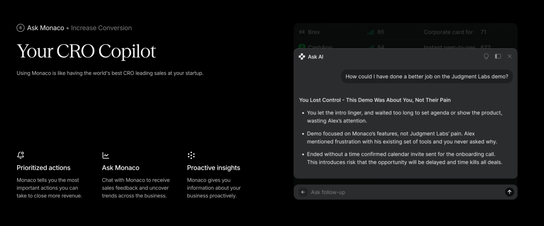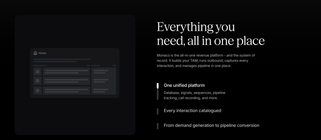 从产品架构来看,Monaco 采用了端到端的方法,覆盖从潜在客户开发、需求生成到收入转化的整个销售流程。这意味着它不是在现有工具栈上增加一个新工具,而是用一个统一的平台替代传统的 CRM 和各种分散的销售点解决方案。更重要的是,Monaco 是一个 AI-native 平台,这意味着它从设计之初就是围绕 AI agent 构建的,而不是后来才加上 AI 功能的传统软件。这种架构上的差异带来了本质上的不同:Monaco 从被动的、依赖用户输入的软件模型转变为一个完全集成的 agent 系统,能够主动推荐并采取行动来生成更多需求并推进交易。