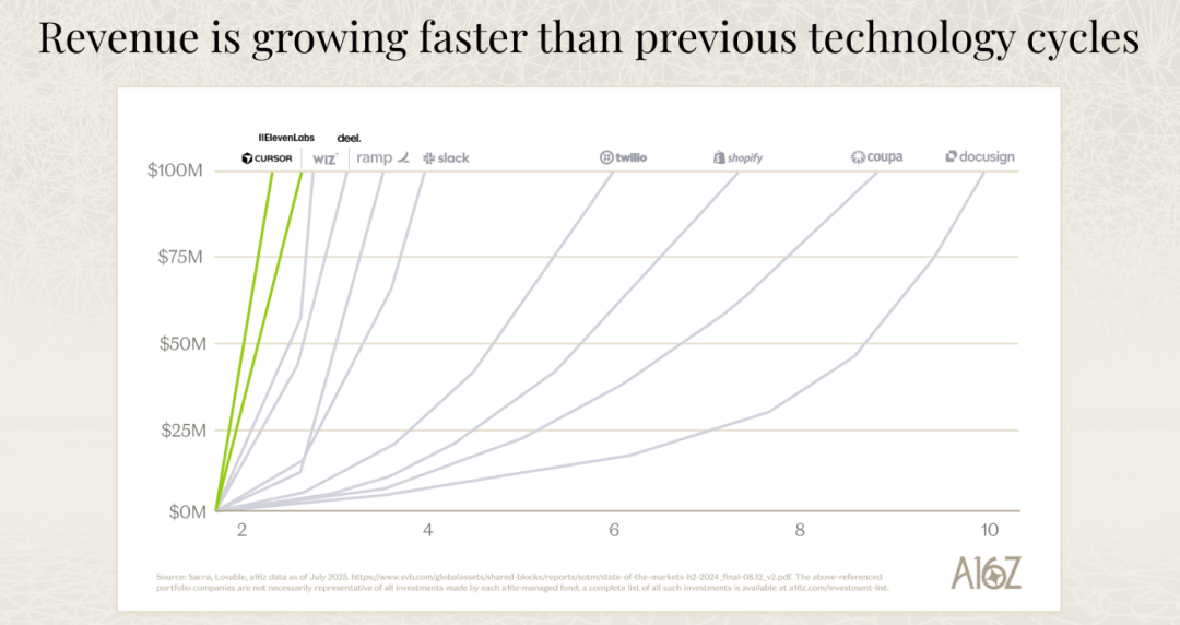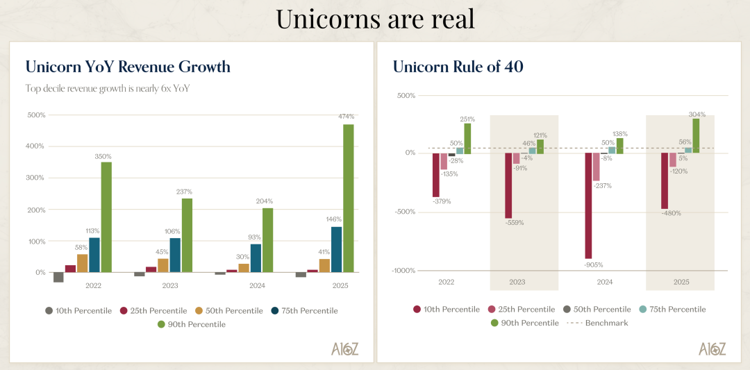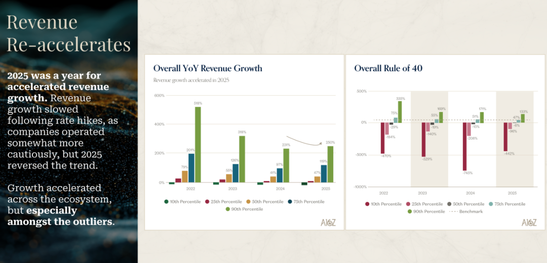 David George 在分享中展示的数据让我重新思考了什么叫真正的增长。2025 年对于 AI 公司来说是一个加速增长的年份。在经历了 2022、2023、2024 年因为利率上升和科技行业收缩导致的增长放缓后,2025 年彻底逆转了这个趋势。最让人震惊的是,按照不同梯队排名的公司中,那些真正的异常值公司,增长速度简直令人难以置信。