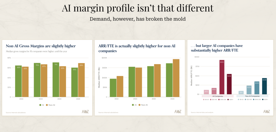 David 展示的另一组数据也很有意思。AI 公司的毛利率实际上比传统软件公司略低一些。他们团队的看法很独特:对于 AI 公司来说,低毛利率某种程度上是一种荣誉勋章。因为如果低毛利率是由高推理成本(inference costs)导致的,那说明两件事:第一,人们真的在使用 AI 功能;第二,随着时间推移,这些推理成本会下降。所以在某种程度上,如果他们看到一个 AI 公司的毛利率特别高,反而会有点怀疑,因为这可能意味着 AI 功能并不是客户真正购买或使用的东西。