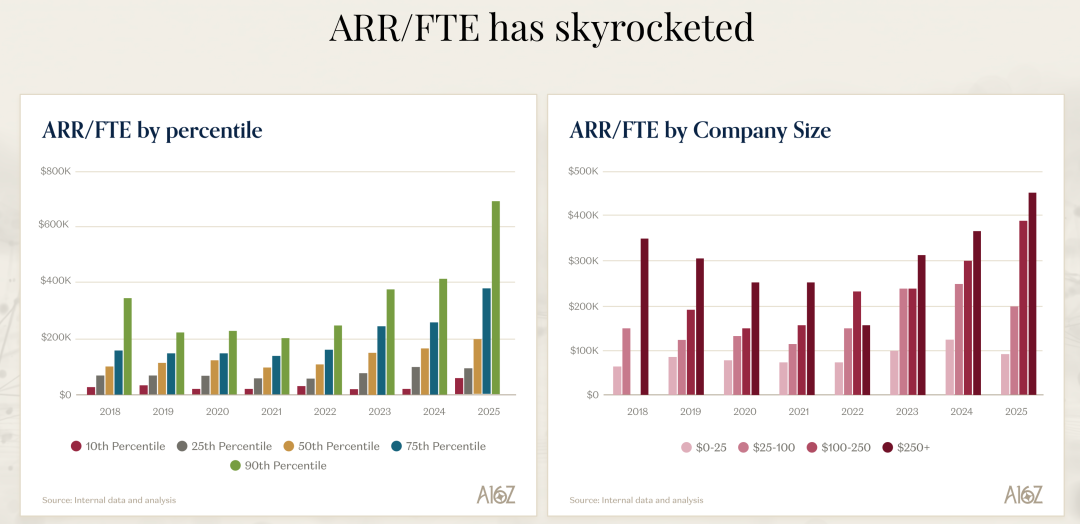 你有没有想过,软件行业可能正在经历一场比从命令行到图形界面更剧烈的变革?最近听了一场 a16z 的 David George 分享的关于 AI 市场的深度分析,我被一组数据震撼到了:最快增长的 AI 公司正在以 693% 的年增长率扩张,而他们在销售和营销上的支出却远低于传统软件公司。这不是个别案例,整个 AI 公司群体的增长速度是非 AI 公司的 2.5 倍以上。更让我觉得不可思议的是,这些公司的 ARR per FTE(每名员工的年度经常性收入)达到了 50 万到 100 万美元,而上一代软件公司的标准是 40 万美元。