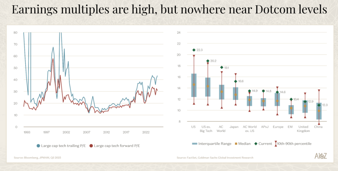 Goldman Sachs 估计,AI 建设将会产生 9 万亿美元的收入。如果假设 20% 的利润率和 22 倍的市盈率,这将转化为 35 万亿美元的新市值。现在已经有大约 24 万亿美元的市值被提前计入了。虽然我们可以争论这是否全部归因于 AI 或者大型科技公司的表现,但仍然有很多市值可以争取,如果这些假设是正确的话,还有很大的上涨空间。