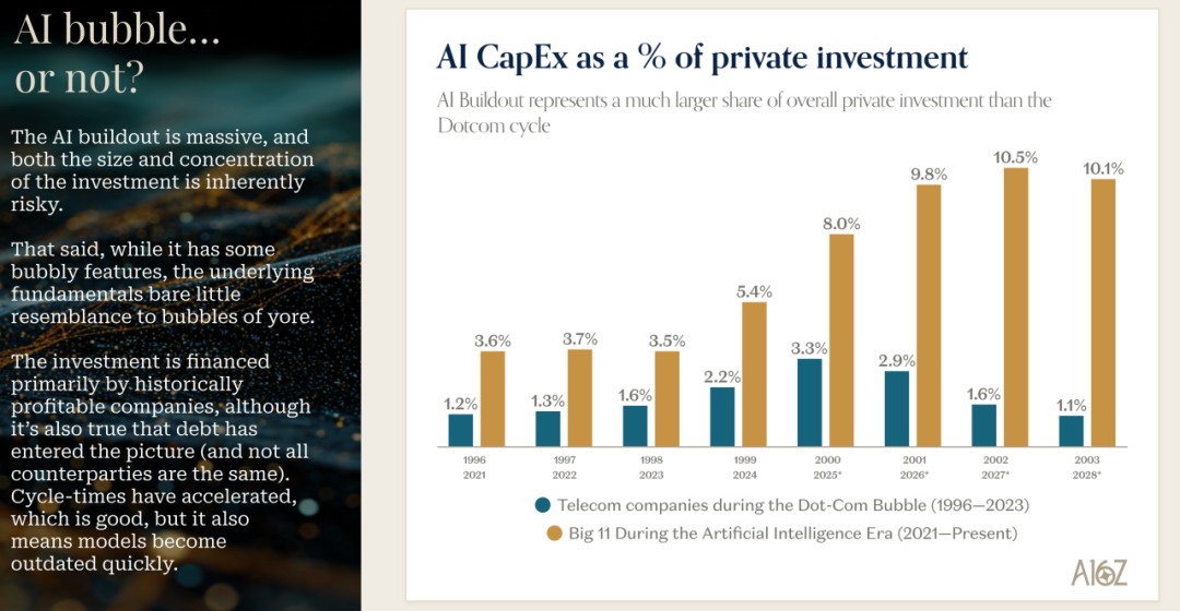 在资本支出方面,David 展示的数据也很有意思。相比于互联网泡沫时期,现在的资本支出实际上是由现金流支撑的,而且资本支出占收入的百分比要低得多。承担最大资本支出负担的是超大规模云服务提供商(hyperscalers),而这些公司是有史以来最优秀的商业公司。