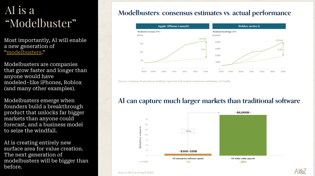 David 在分享中提到了一个我觉得特别有洞察力的概念:Model Busters。这是指那些增长速度和持续时间远远超出任何人在任何情境下所能预测的公司。iPhone 是这个概念的经典案例。如果你看 iPhone 发布前的共识预测,和 4-5 年后的实际表现,共识预测偏离了 3 倍。而这是全世界最受关注的公司。