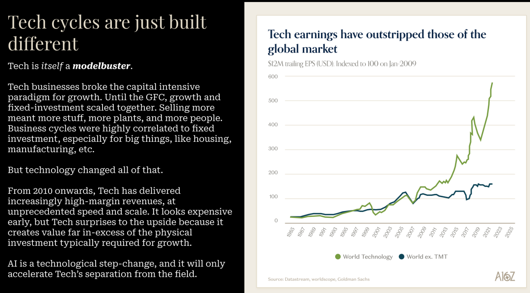 他提到,科技本身就是一种 Model Buster。但自 2010 年以来,科技以前所未有的速度和规模提供了高利润率的收入。所以它早期看起来总是很贵,但反复出现超预期的表现,创造的价值远远超过所需的资本。他没有理由认为这次会有什么不同。