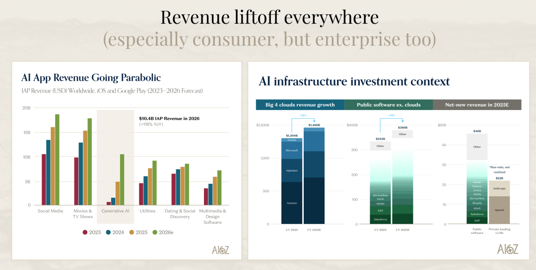 David 展示的一组数据特别震撼。他比较了云服务、上市软件公司,以及 2025 年新增的净收入。上市软件公司在 2025 年总共新增了 460 亿美元的收入。如果你只看 OpenAI 和 Anthropic 这两家公司,按照运营收入计算,它们新增的收入几乎是这个数字的一半。