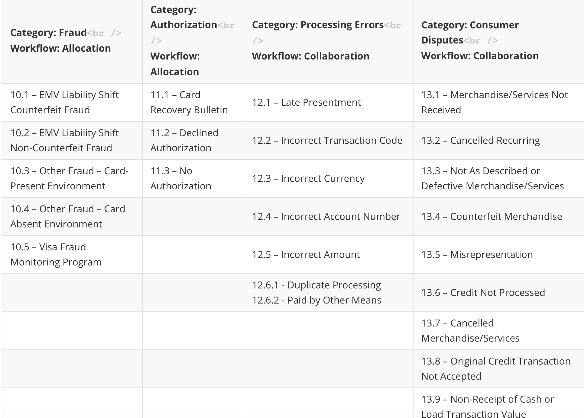 Visa的争议工作流根据拒付代码的类型分为两类Allocation和Collaboration。