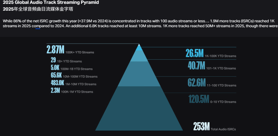 同时,大量音乐事实上从未被听见。根据Luminate年终报告数据显示,尽管2025年净新增的ISRC(国际标准音像制品编码)相较2024年增长3790万首,其中86%的新增曲目播放量都集中在年播放≤100次的层级,约88%的曲目年播放量在1000次或以下(达不到Spotify获得版税的最低门槛)。