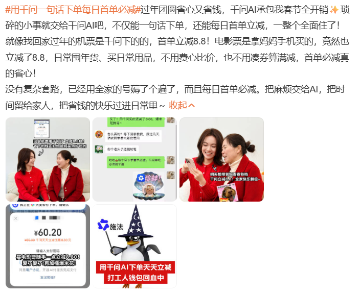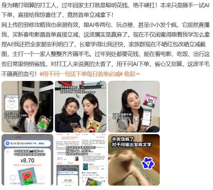 更有全家总动员——爸妈买年货用千问,自己点奶茶用千问,买电影票也用千问,全家比拼谁省得多,硬是把省钱玩成了春节家庭保留节目,在欢声笑语中,千问AI下单变成了一种“新式年味”。