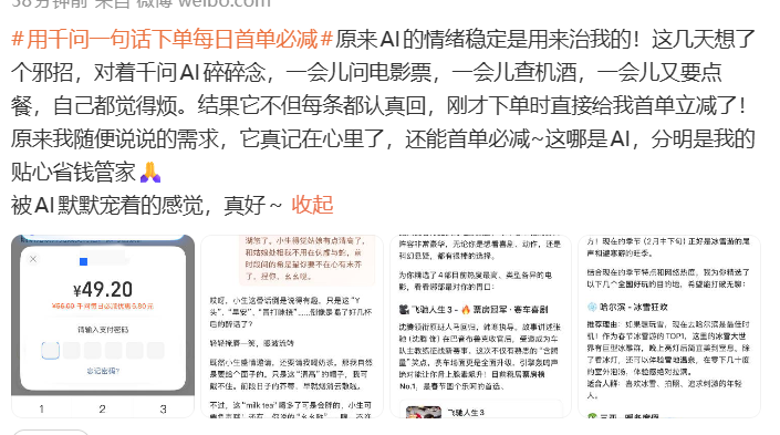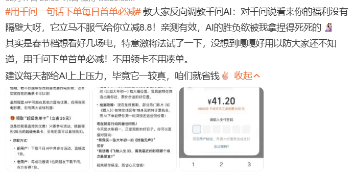 还有人总结出千问“省钱攻略”:跟AI夸两句、玩点梗、甚至小小发个疯,买新春电影票首单直接立减,把AI调教得明明白白。