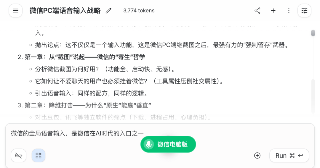 微信此时注重电脑端的全局语音输入,本质上是为了给微信,在 AI 时代中,抢夺一个关键的交互通道。