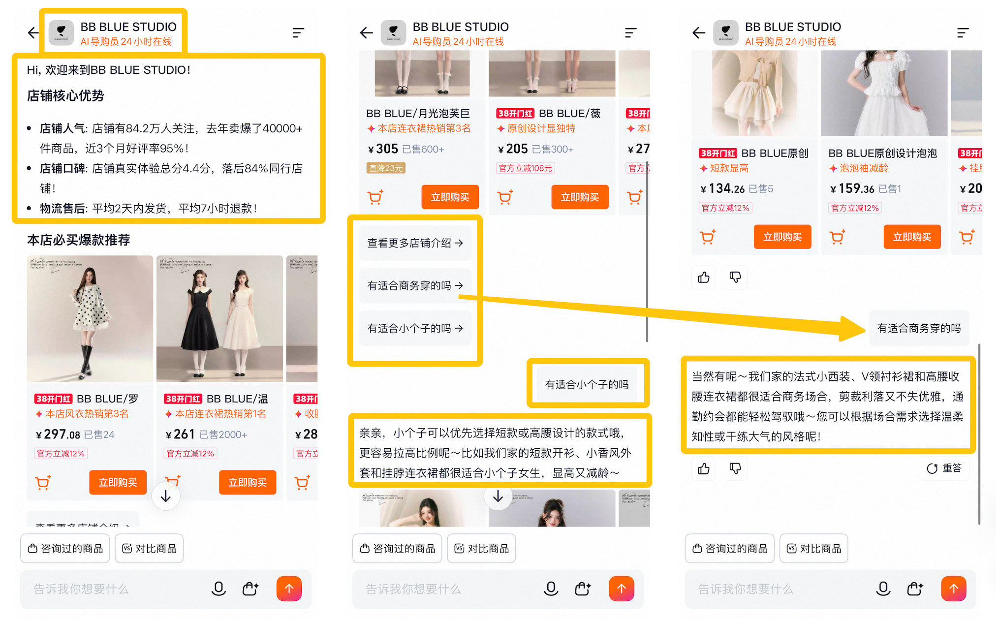 从商家角度来看,引导性问句也起到了一个实际的作用——它降低了用户表达的门槛,让不知道该问什么的人,也能顺着对话往下走,在页面多待一会儿,最终更清晰地找到自己想要的东西。