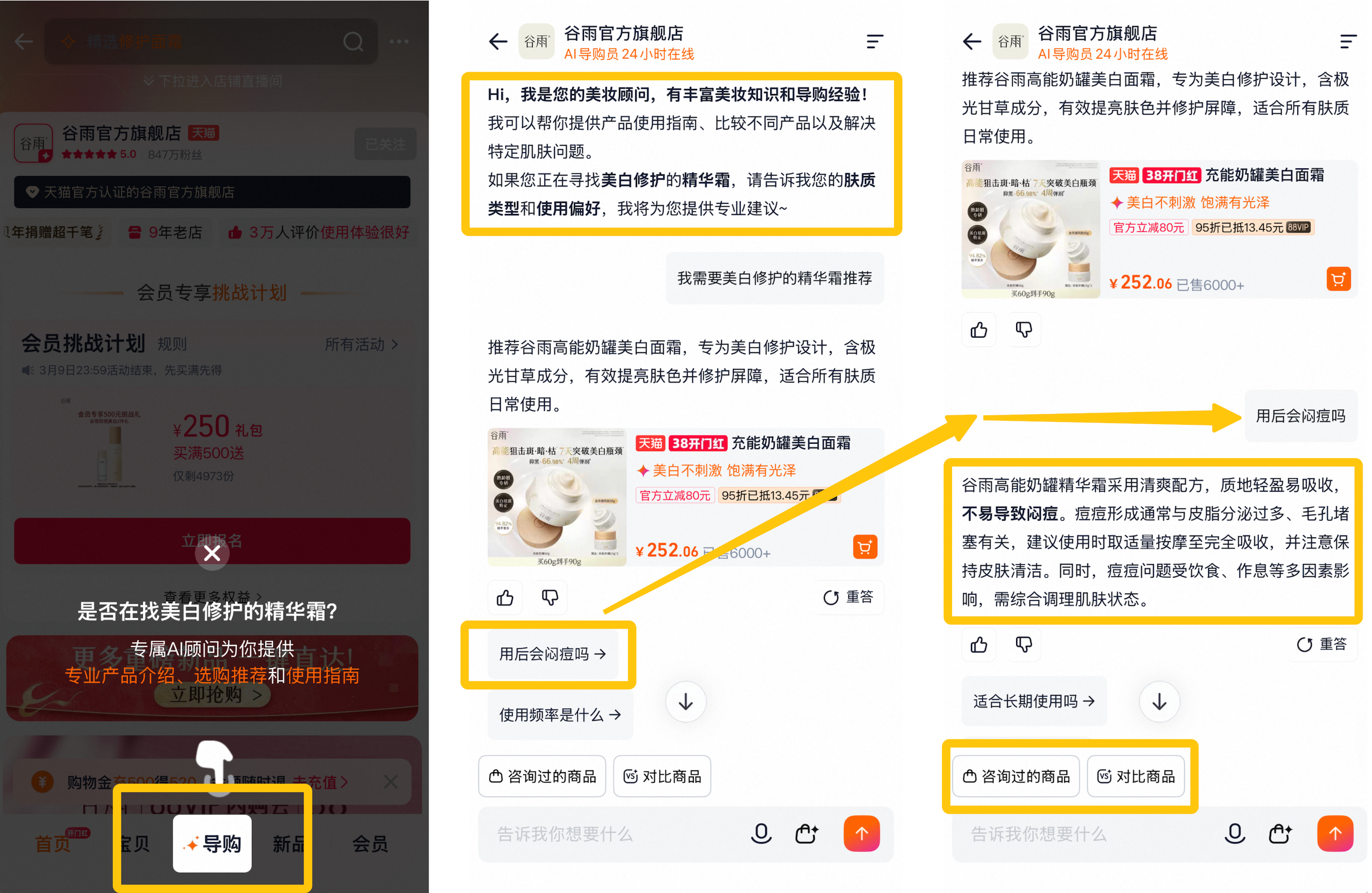没急着下单,点开了页面底部一个叫”导购”的小入口,随手问了句:”用后会闷痘吗?”