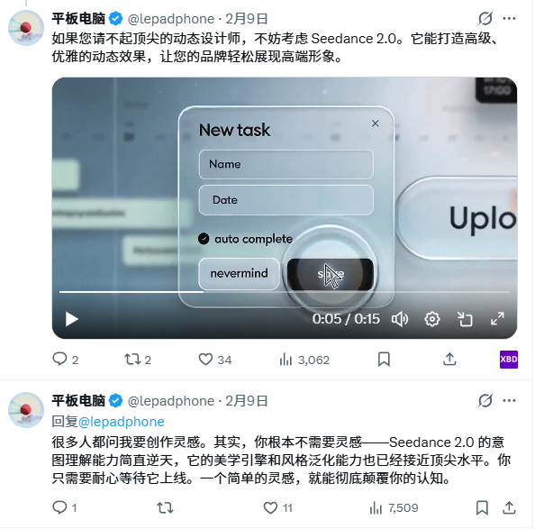 这几天海外推特X上,到处都是Seedance 2.0的案例 ,就像2023年的chatGPT、2024年的Sora、2025年的Nano banana那样出圈。