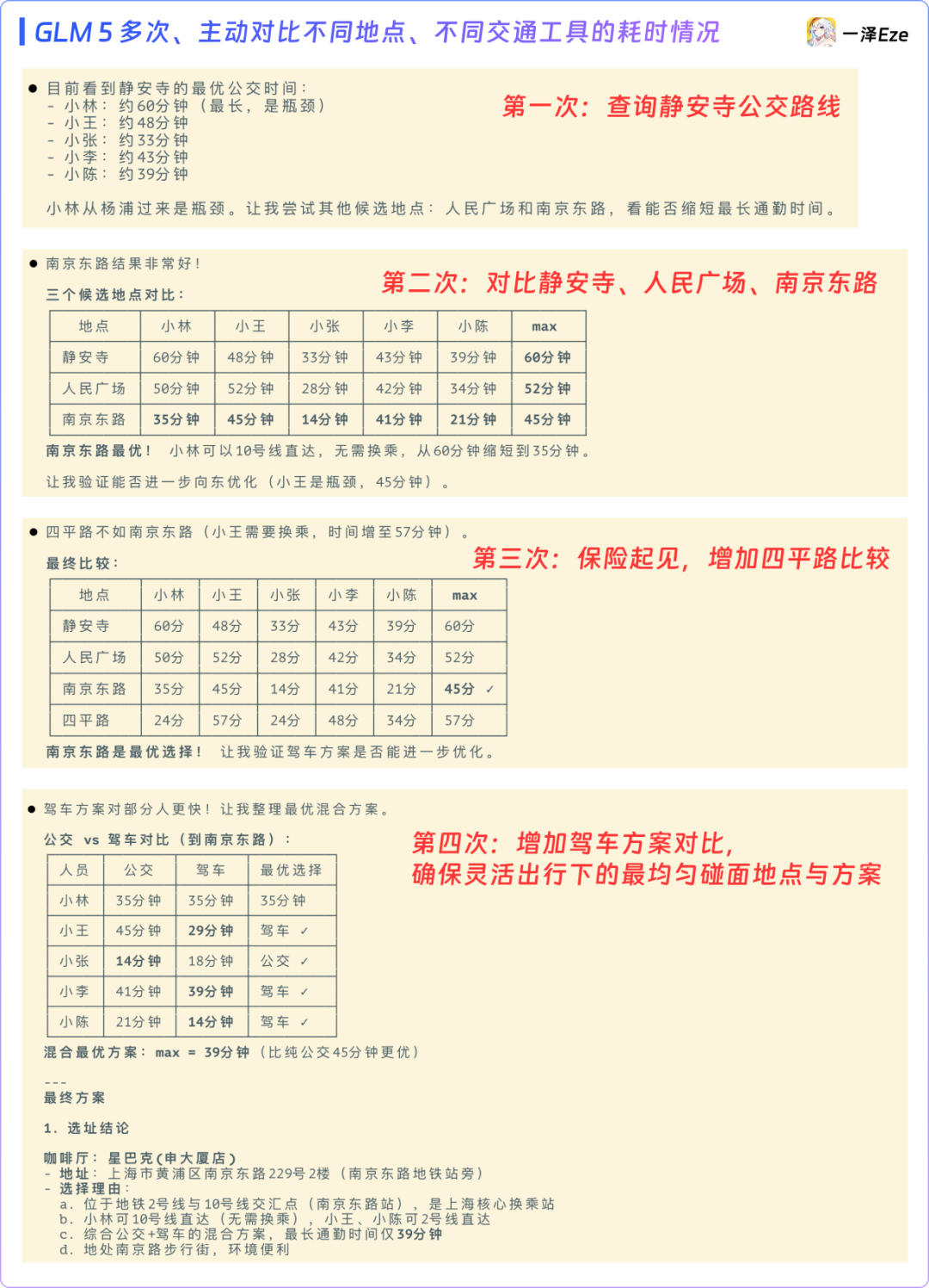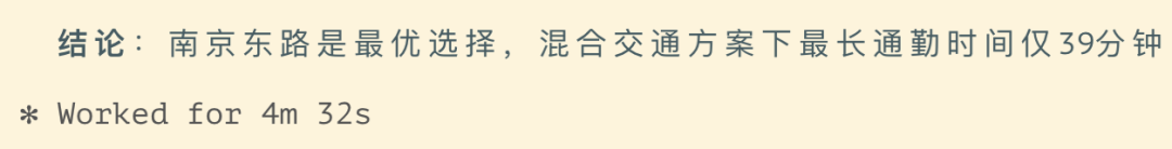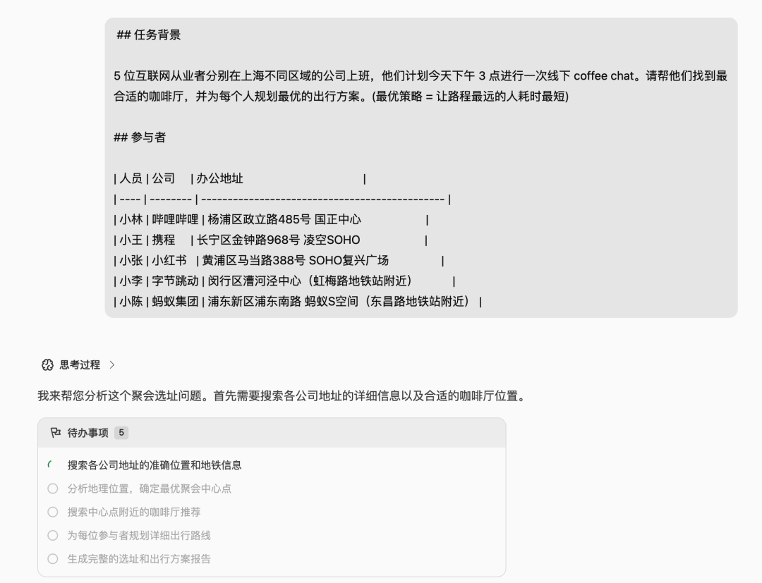 在无人干预的 4 分钟内,它自主调用 40 次地图工具,交错思考 25 轮后,一次性给出了综合各方通勤距离的选点方案,附带每个人的出行建议。
