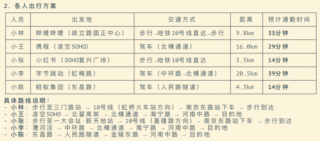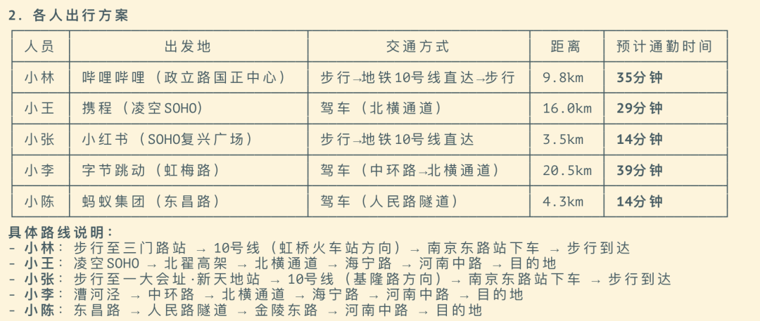 最终输出了各人出行方案,包含每个人从哪出发、走哪条线路、坐什么交通、预计多久到达。