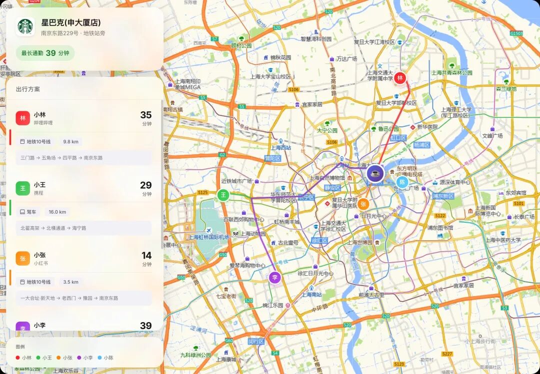 如果不是我说,你肯定想不到这是 Agent 生成的临时地图,在聚会时能省下太多决策与寻路精力。(甚至在高德 APP,我们没法做出同时查询多人路线)