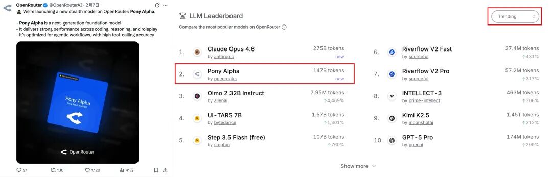 一个叫「Pony Alpha」的匿名模型,悄悄出现在 OpenRouter 上,占据模型趋势榜前列。