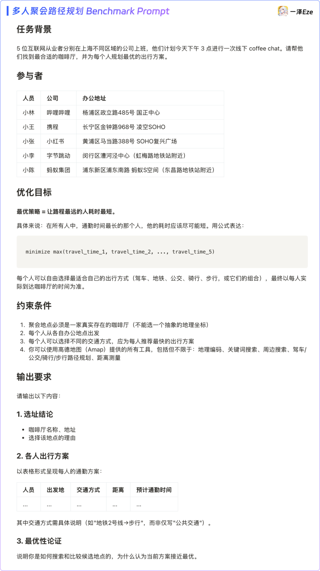 只要把每个人的出发地和交通偏好列出来,Agent 就能自动找出一个对所有人通勤最公平的聚会地点(最优策略 = 让路程最远的人耗时最短)。