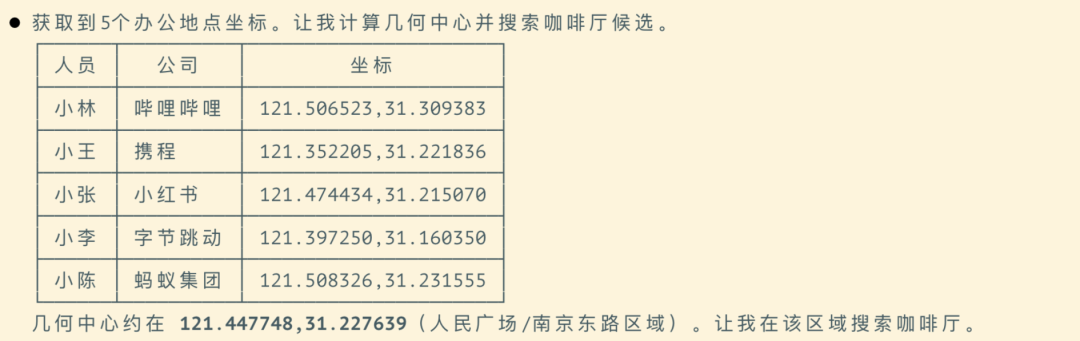 相较于人类用户自行翻查地图 APP,分次输入每个人的起点、目标点,Agent 能一次性查询目标地区的多家咖啡店,并考虑不同交通方案,大幅提升此类决策的效率与准确度,整个流程快了太多。