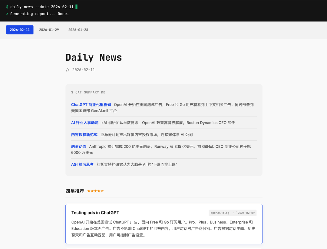 最终,GLM-5 一次性完成了日报的信源抓取、入库、分条摘要、合并日报、网站更新的全过程。相当顺滑、实用。