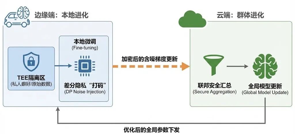 - 安全汇总:通过联邦学习,模型更新的参数在经过差分隐私“打码”加密后上传云端。这保证了 AI 的整体进化依赖群体智慧,但你的私人癖好只锁在 TEE 隔离区里。