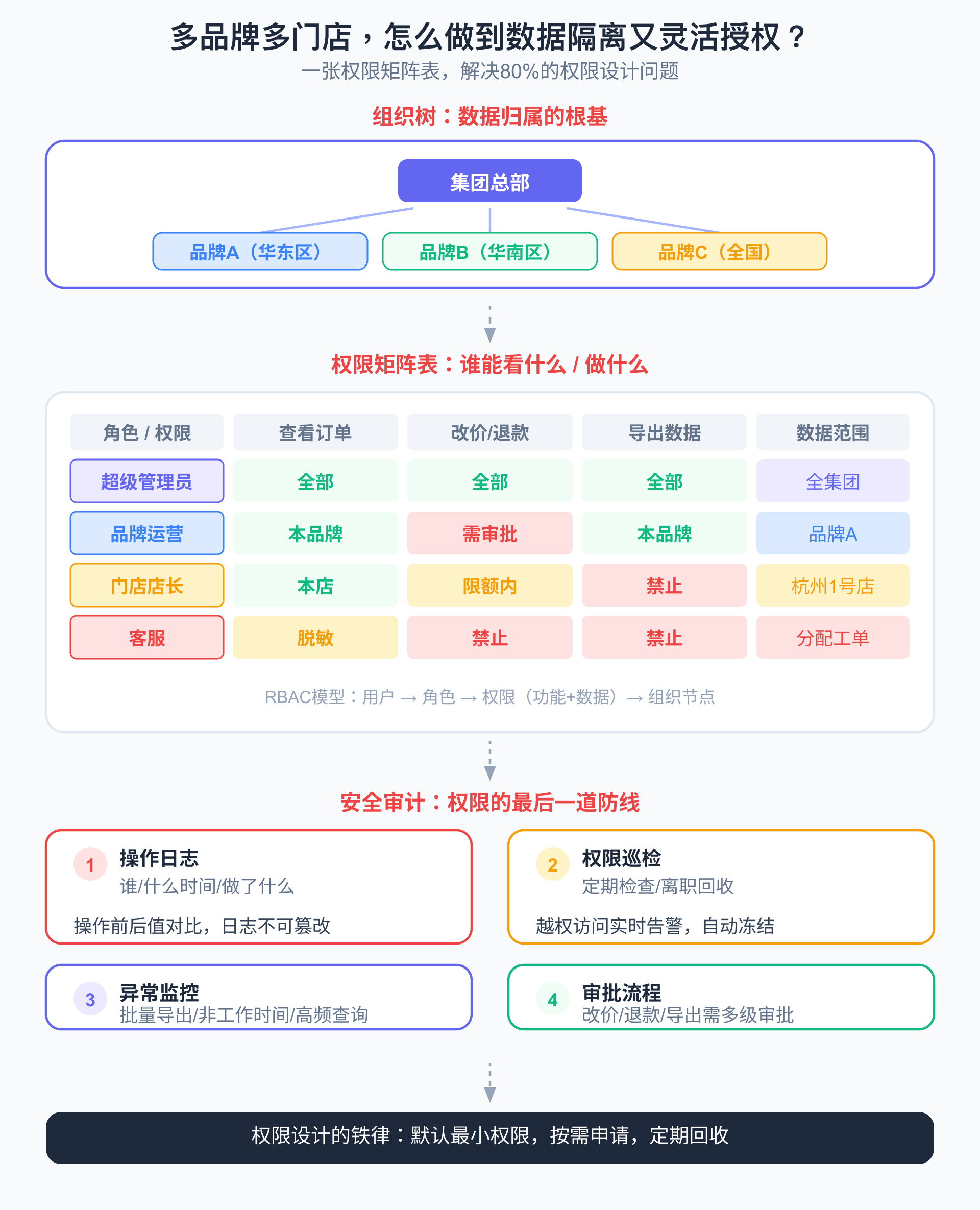 核心问题: 多品牌多门店,怎么做到数据隔离又灵活授权?