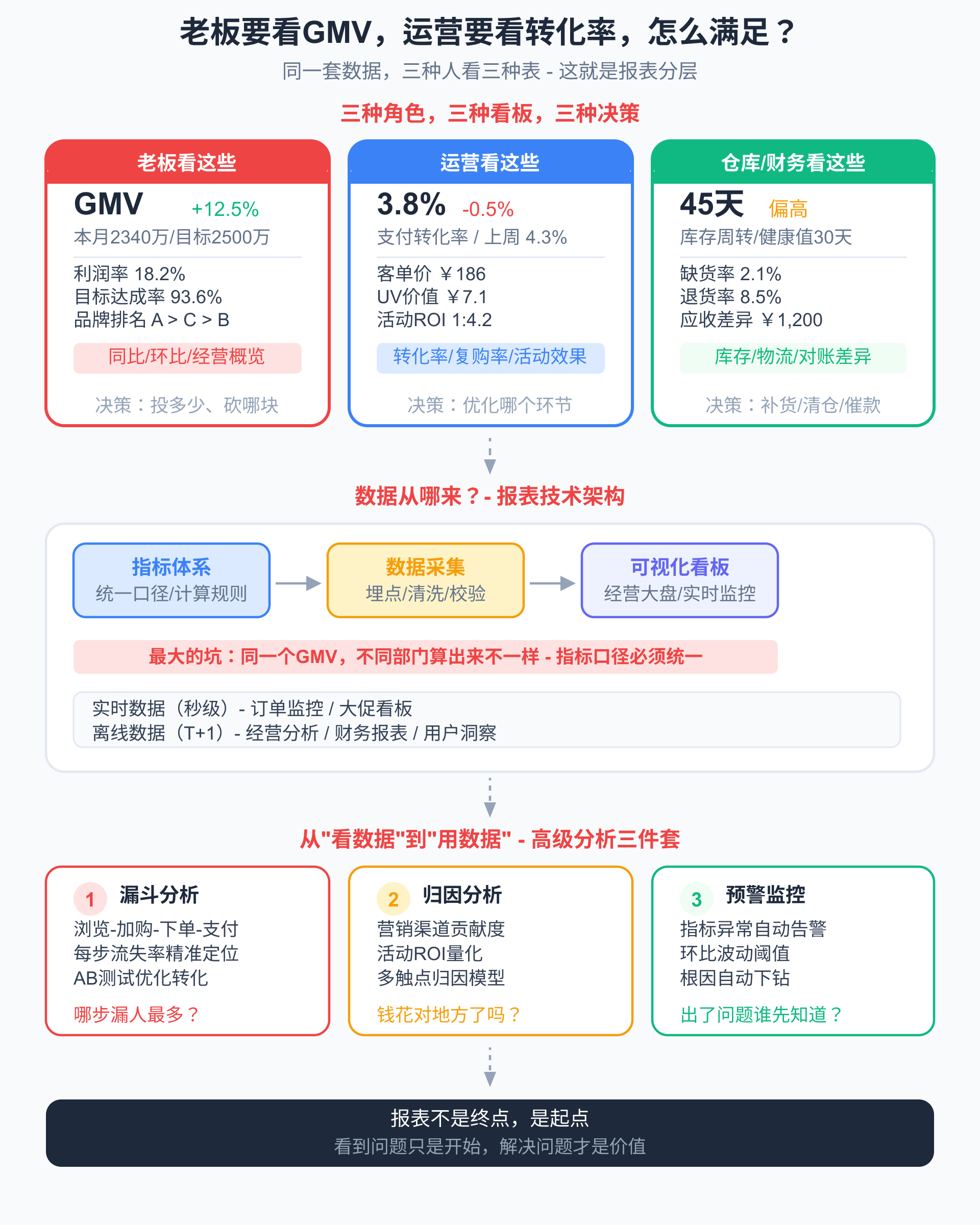 核心问题: 老板要看 GMV,运营要看转化率,怎么设计一套报表满足所有人?