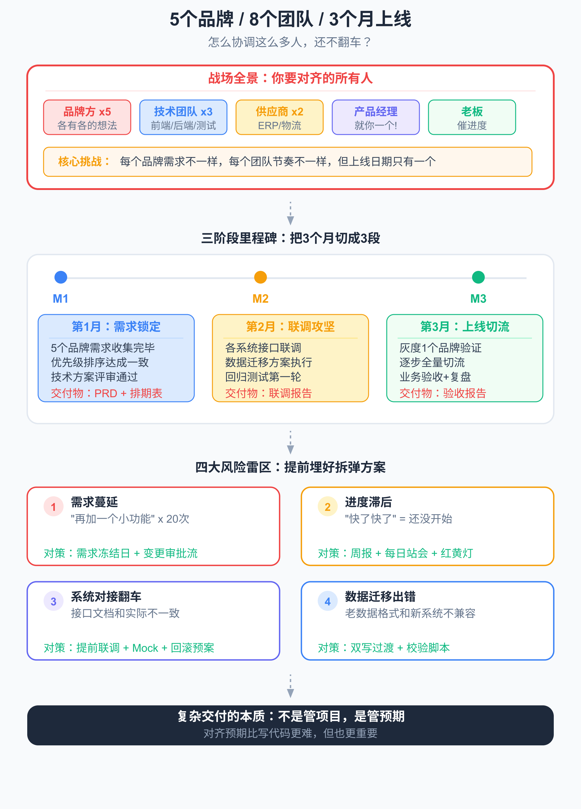 核心问题: 5个品牌、8个团队、3个月上线,怎么不翻车?
