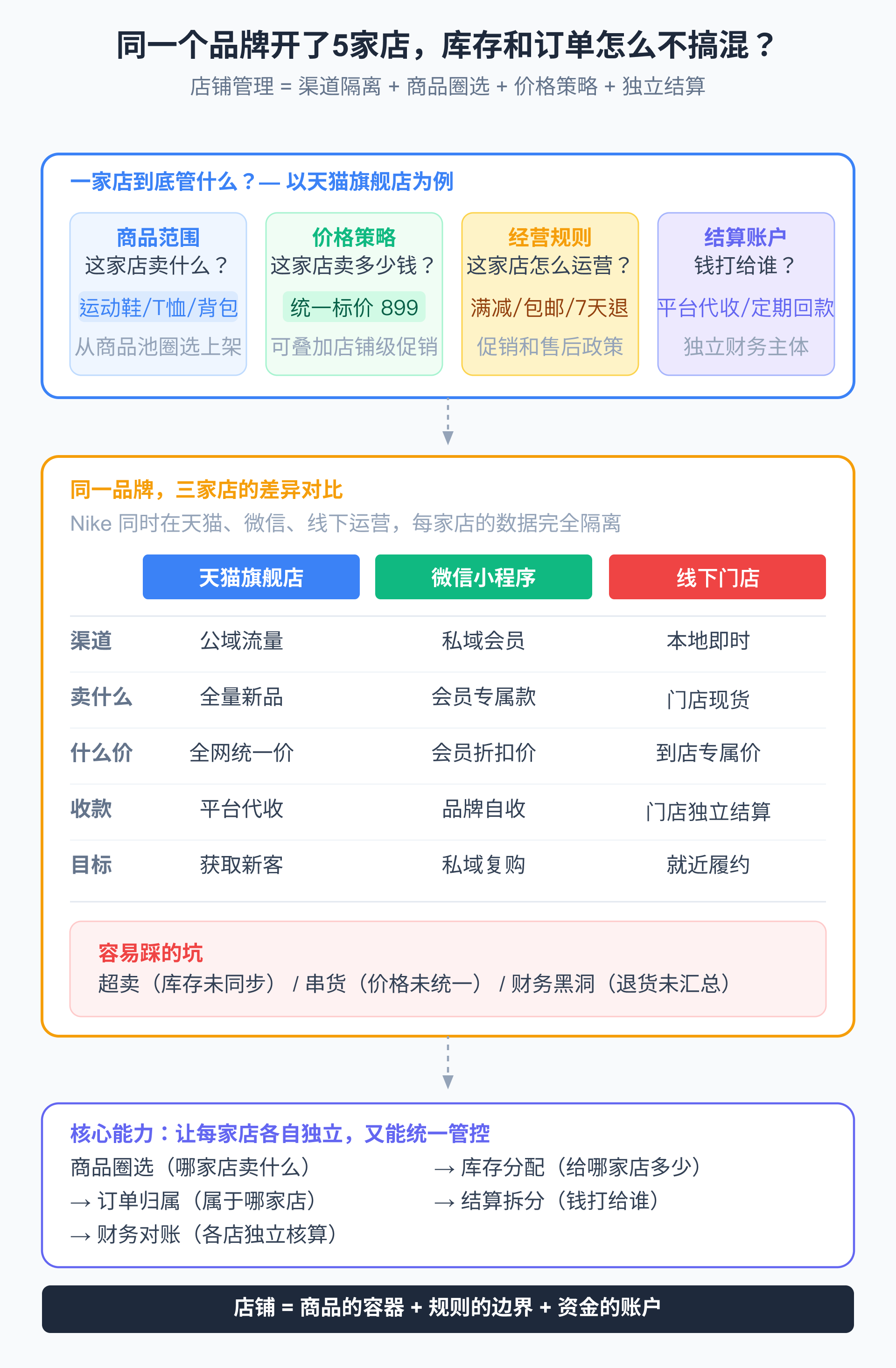 核心问题: 同一个品牌开了 5 家店,库存和订单怎么不搞混?