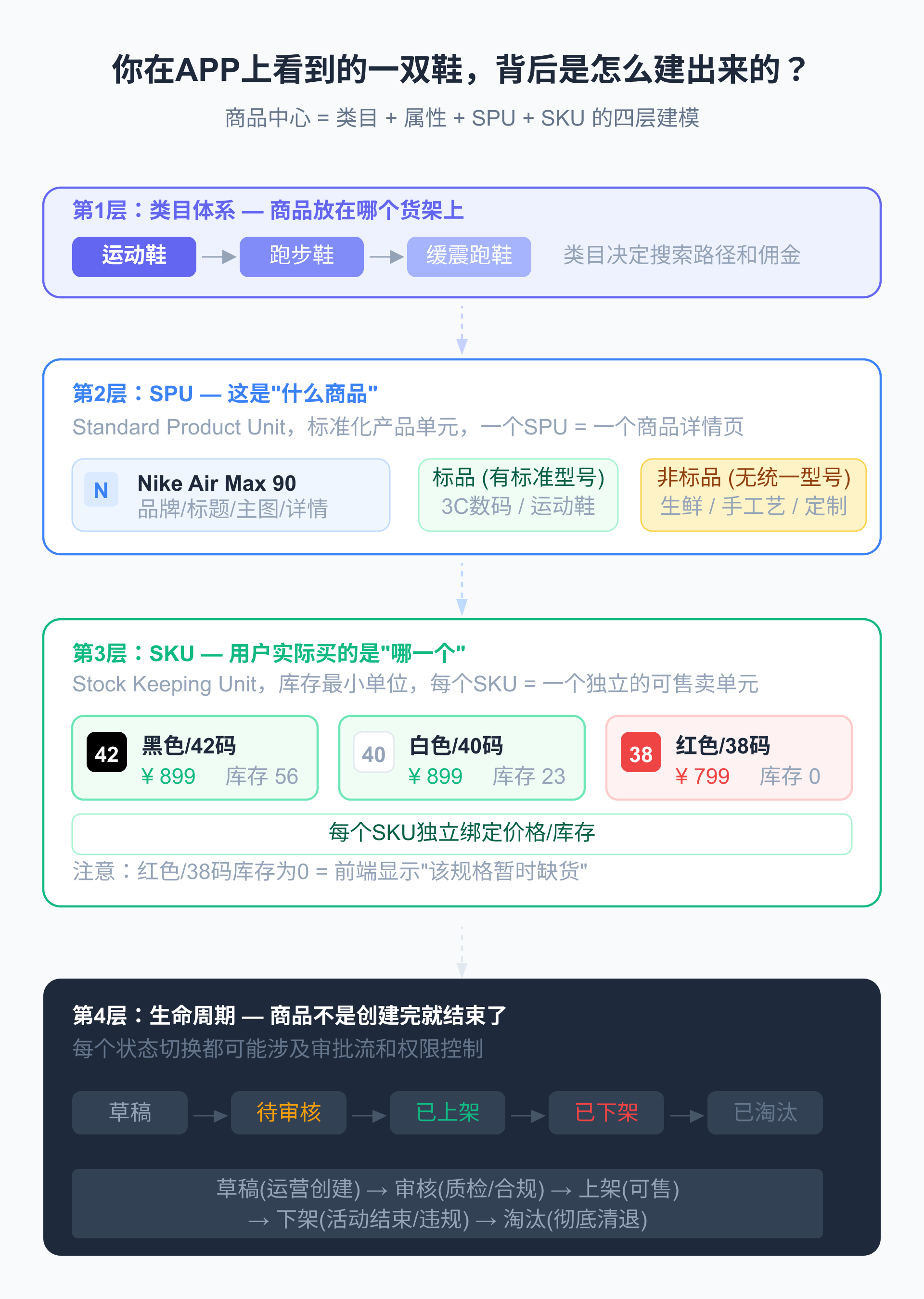 一句话定义: 管理”卖什么”——从类目、属性、SPU/SKU 到商品生命周期