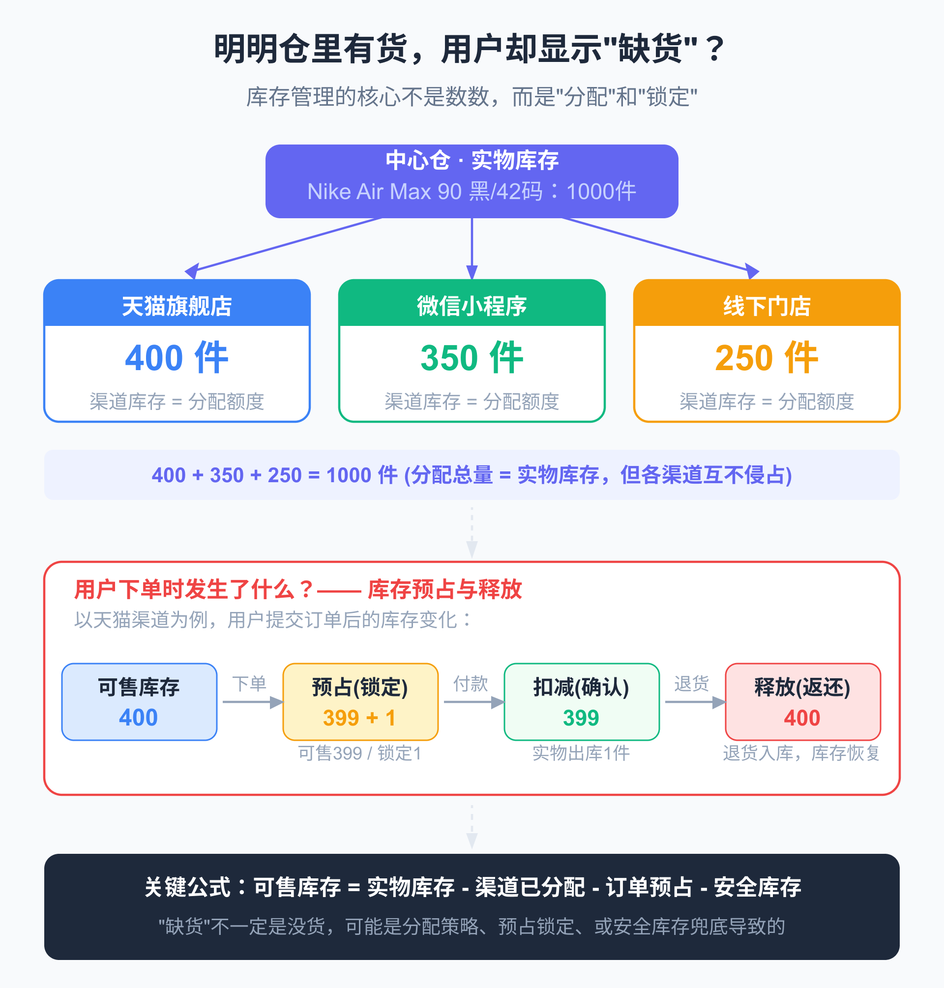 一句话定义: 管理”有多少货”——实物库存、渠道库存、预占与释放