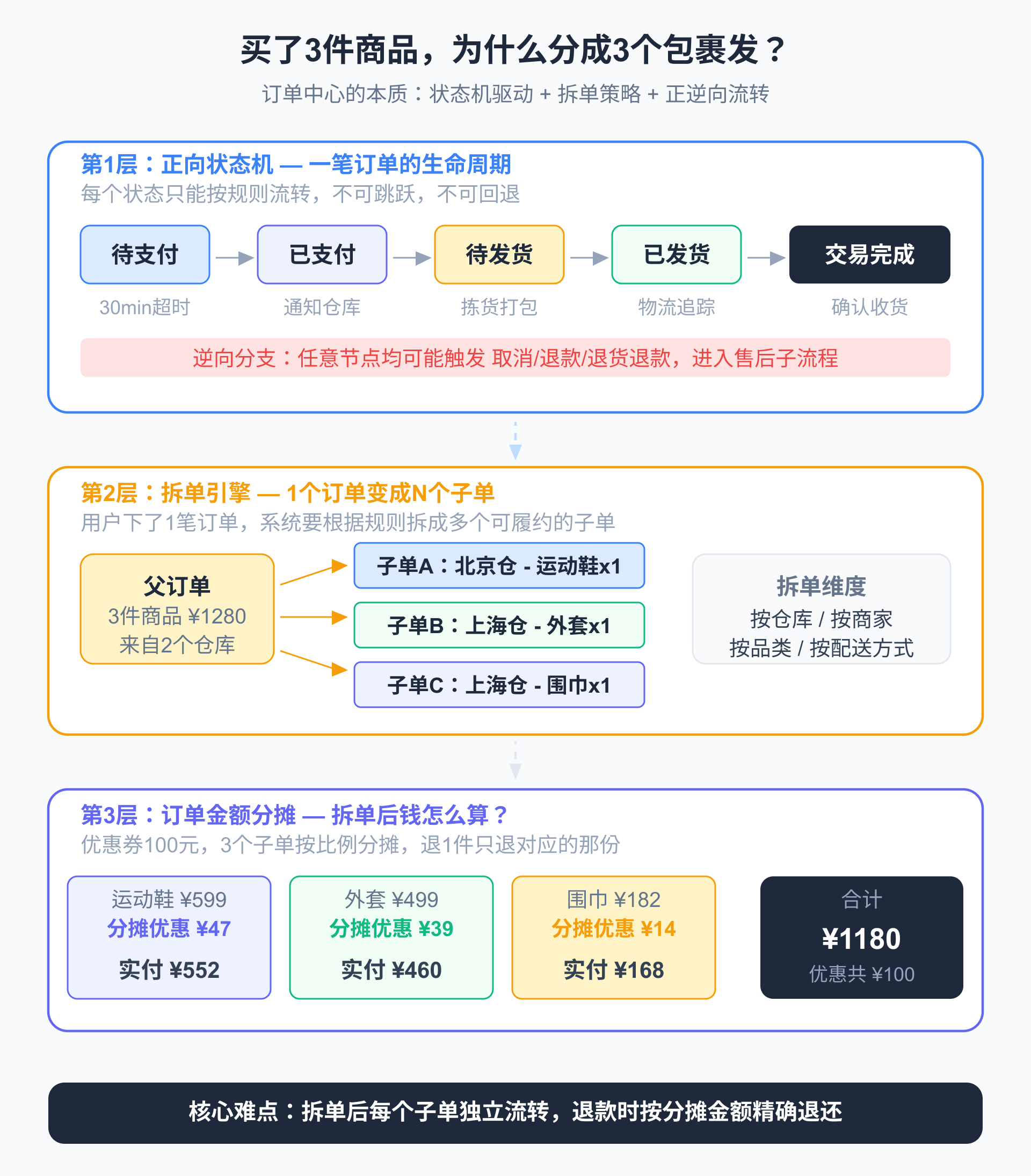 核心问题: 一个订单要拆成3个包裹发,状态怎么流转?
