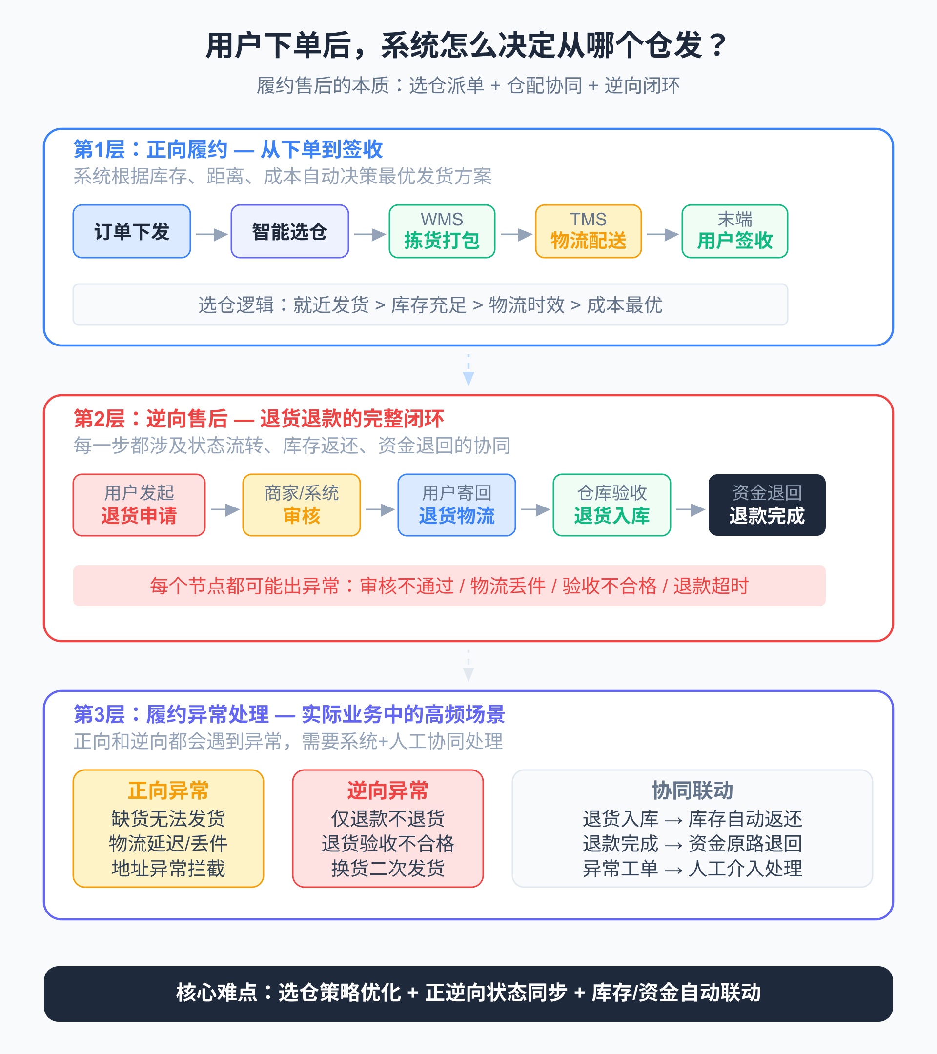 一句话定义: 管理”货怎么到用户手里”——仓储、物流、签收、退换货