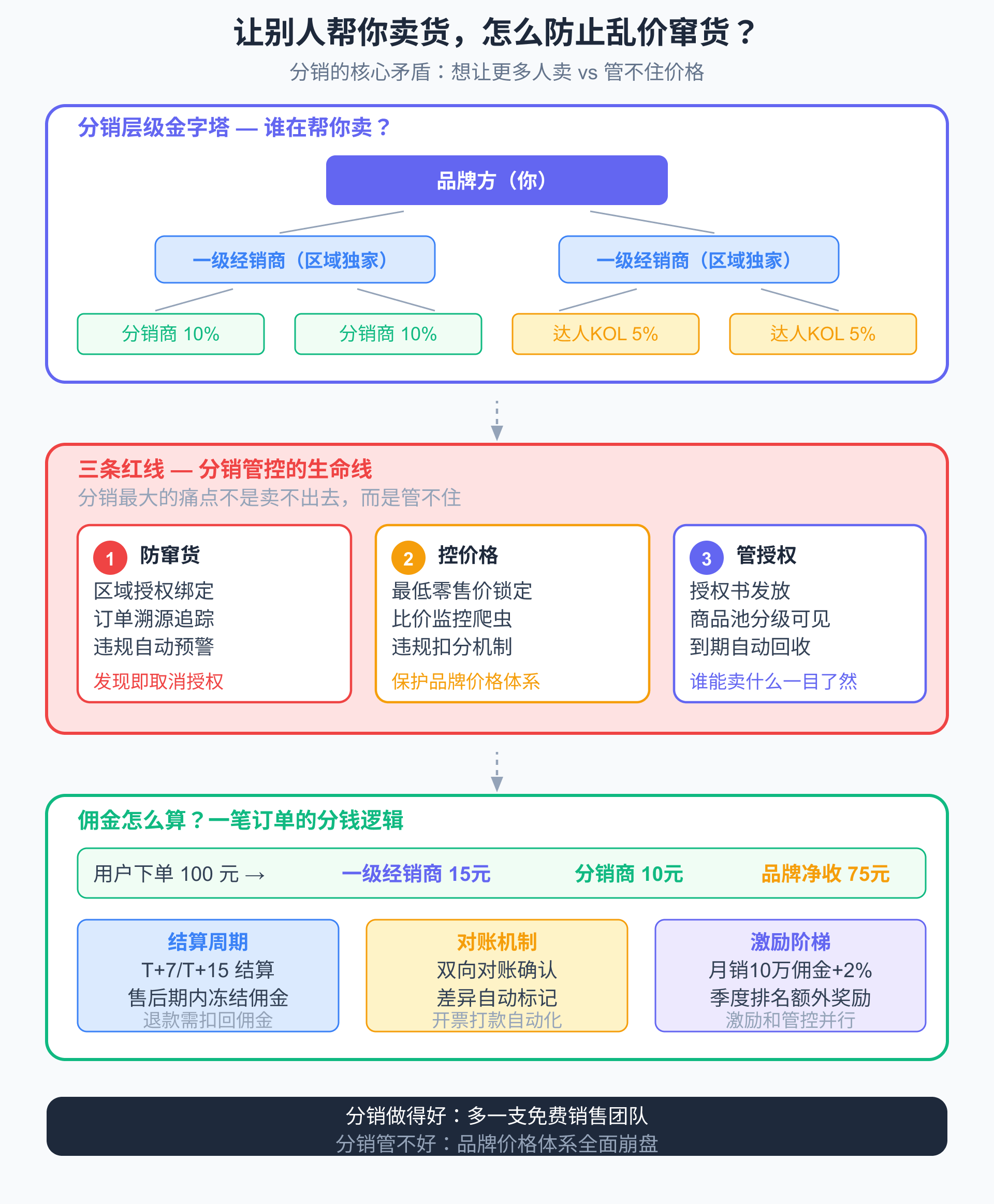 一句话定义: 管理”让别人帮你卖”——分销商管理、商品分发、佣金结算