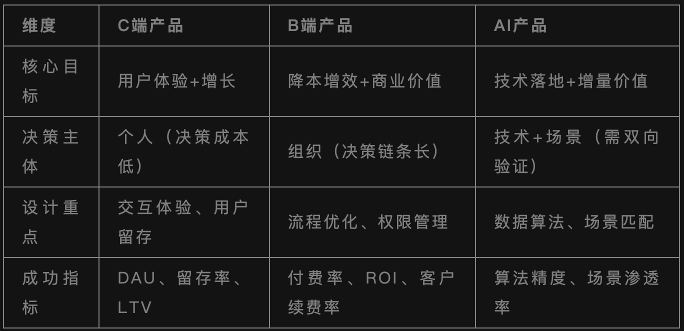 C端、B端与AI产品的设计思路差异,皆源于价值核心与服务对象的不同,其底层逻辑始终是围绕真实需求解决问题。
