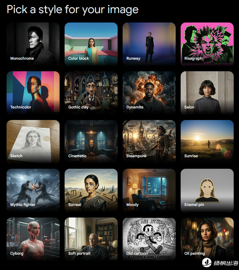 首先,可以看到在NB 2的主页面中增加了各种参考风格模板,这是之前的版本中没有的。而且这些图并不是那种传统的,像如二次元、像素风、电影写真一样的分类,而是一种更具设计感、艺术感,带有情感且更具象化的表述,比如哥特式粘土、超现实主义、老动画片、神话战士等等,在初始阶段就为用户提供了设计灵感。